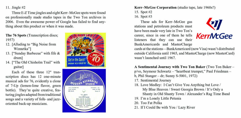 | The Crosley-Bendix shows, on transcription disc, were five-minutes shows with a song and a plug for an appliance. The E-Z Time and Kerr-McGee ads were found on tapes in the Baker archives in 2006; it's not known when they aired. The 76 spots, also on transcription disc, presented clever musical jingles, most based on familiar tunes, touting the virtues of 76, a lemon-lime drink made by the American 76 Company of Skokie, Illinois. A Sentimental Journey with Two Ton Baker was a 1972 stereo LP reissue of some of Two Ton's best 45 rpm sides for Sunny. The 17-minute Schaden interview, by telephone, appears to be the last recording of Two Ton Baker. |